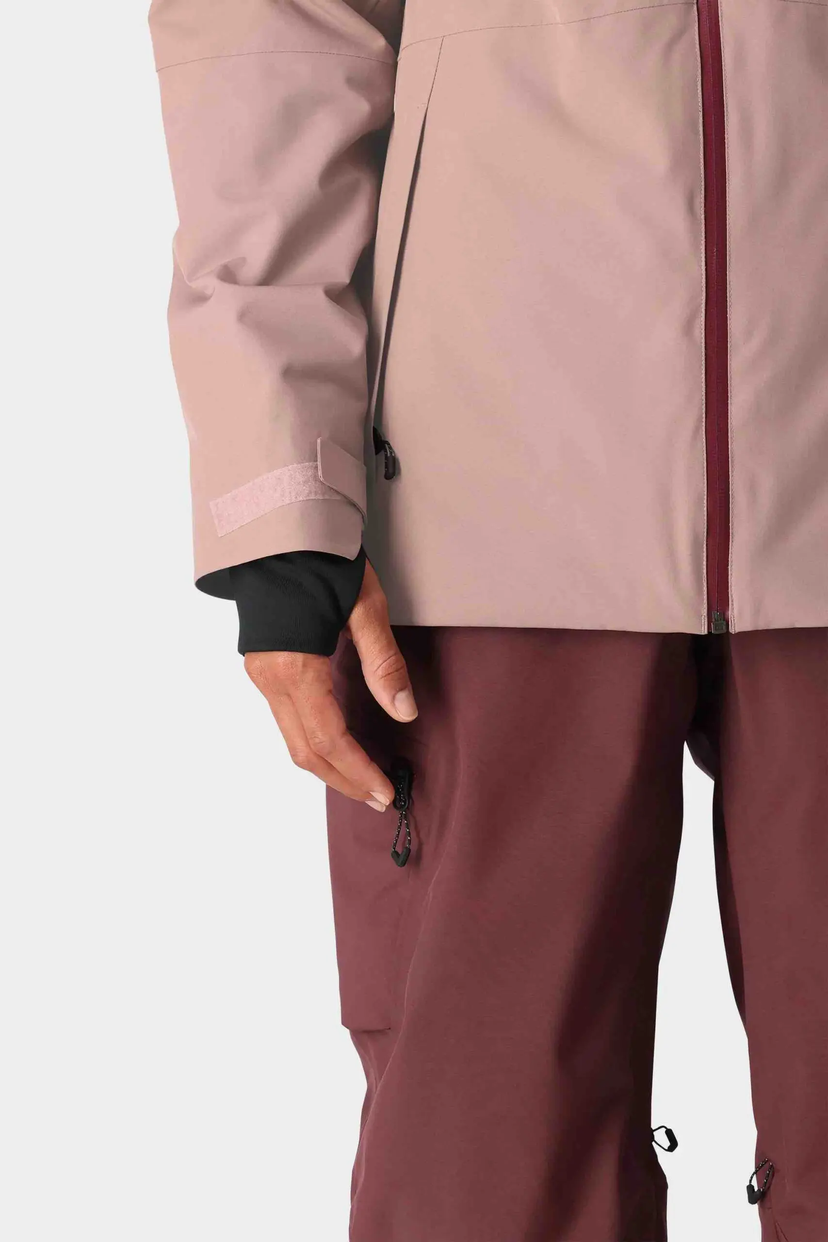 HOODLINK– The jacket is folded, rolled, and then the hood bungy tightens around the bundle to keep it that way.